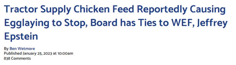 That didn't stop the Gateway Pundit from blaring in a tweet, "Tractor Supply Chicken Feed Reportedly Causing Egglaying to Stop, Board has Ties to WEF, Jeffrey Epstein."