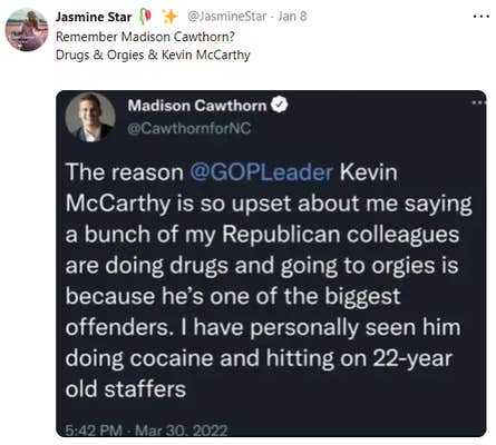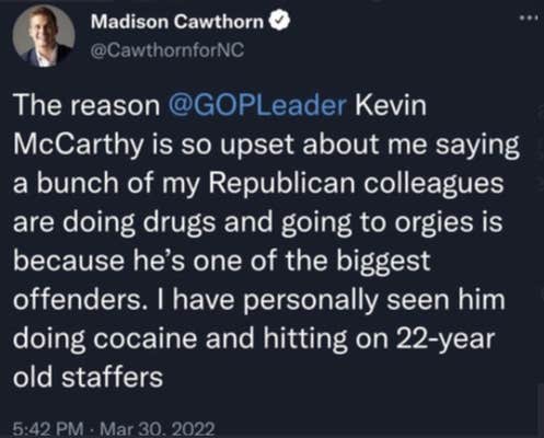 While Cawthorn did go on a podcast at the time and accuse his fellow Republicans of doing cocaine and going to orgies, he didn't name anyone in particular. And he never tweeted this about McCarthy.