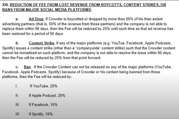 The contract included significant penalties if Crowder lost advertisers, received content strikes from major platforms, and/or was banned by the same.