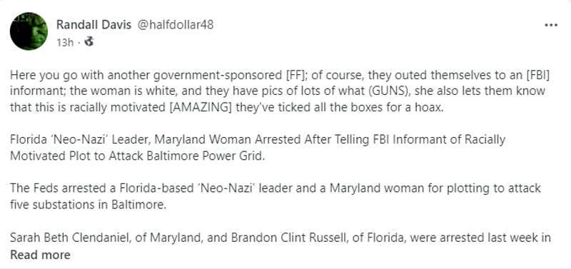 "Here you go with another government-sponsored [FF]; of course, they outed themselves to an [FBI] informant; the woman is white, and they have pics of lots of what (GUNS), she also lets them know this is racially motivated [AMAZING]," @halfdollar48 wrote on Gab, adding, "they've ticked all the boxes for a hoax."