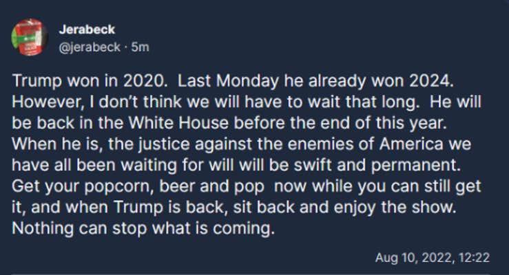 There was one occasion that she saw fit to delete an internet musing. Bridge Michigan reports that last summer, Karamo tweeted a link to a post on Truth Social claiming Trump would be back in office within the year. The post also said that when this occurred, “the justice against the enemies of America we have all been waiting for will [...] be swift and permanent”—which sounds kinda like a threat.
