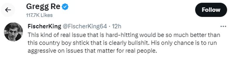 Also Sunday night, Re liked a tweet accusing DeSantis of putting on a "country boy schtick that is clearly bullshit."