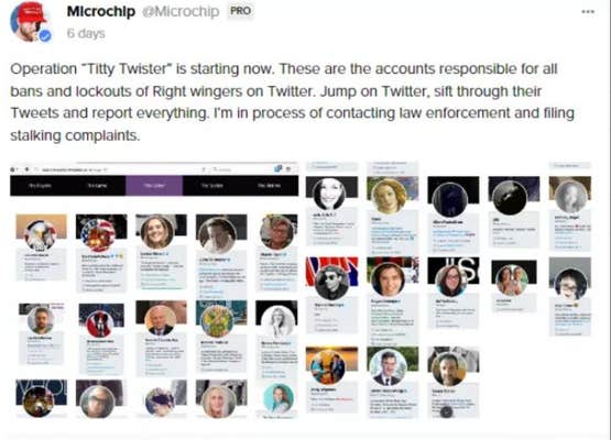 For operation titty twister, Microchip compiled a list of accounts he blamed for the bans and suspensions of right-wing Twitter users. He circulated this list and urged people to report their accounts.