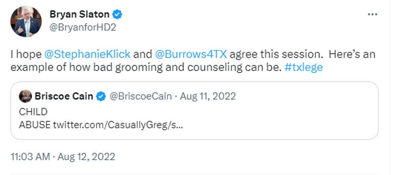 If it turns out that Slaton did have sex with an intern, which is being investigated, he may want to think about deleting his many, many tweets about grooming kids.