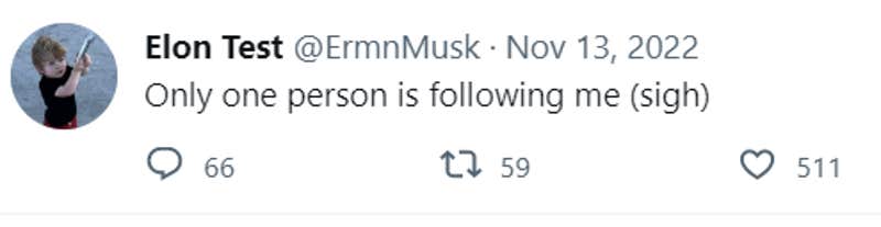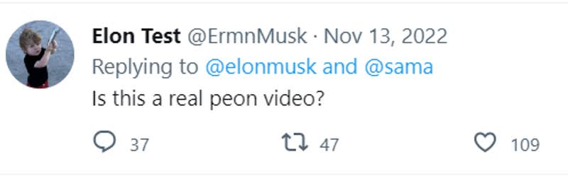 In one of the account's first remarks, Elon Test replied to a photoshopped picture Musk tweeted of FTX founder Sam Bankman-Fried in a video on PornHub. The fake PornHub video was captioned, "Man Fucks 5 Million People At Once," a reference to the collapse of his FTX cryptocurrency exchange.
