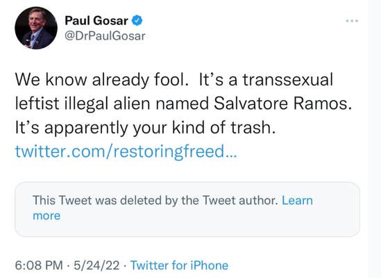 But Gosar’s biggest offense is when he falsely claimed the Uvalde school shooter was trans, a lie that originated on 4chan.