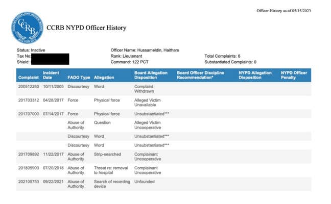 Hussameldin racked up 6 formal complaints involving 9 accusations, from multiple allegations of abuse of authority and overuse of physical force to smaller accusations such as committing time theft and falsifying records by claiming overtime hours he never worked.