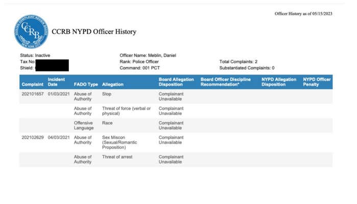 A photograph of Meblin in the 50-a database matches that of an officer who was hired by the Palm Beach Police Department the same month that Meblin left the NYPD.