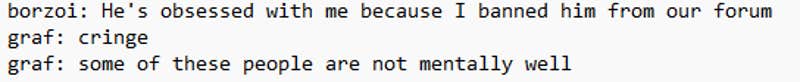 In a subsequent conversation between the two, borzoi referenced banning someone from his forum and opined that the man was "obsessed" with him as a result.