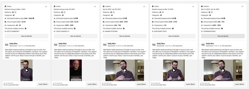 Titled “No one cancels Matt Walsh,” the ads amassed millions of impressions and have been renewed as recently as May 1. While they defend Walsh, they’re also soliciting new subscriptions by urging potential customers to “stand up for free speech” and show their support by becoming DailyWire+ members.