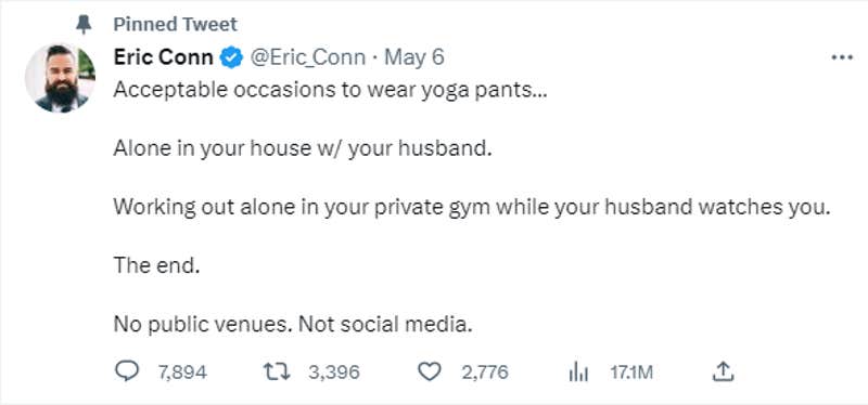 The mom, @shesbonky, was inspired by Christian podcaster Eric Conn sharing his thoughts about when and where women should wear yoga pants. In his opinion, the only "acceptable occasions" for women to wear the popular athleisurewear is at home with their husband.