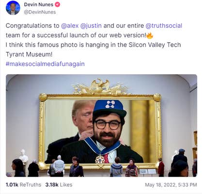 The Daily Dot has since learned that an admin for Stevens' site worked on Truth Social. Alex Gleason is head of engineering for Trump's site and an admin for Poast. Executives with Truth Social, including former congressmen Devin Nunes, thanked Gleason for his contribution to the platform on multiple occasions.