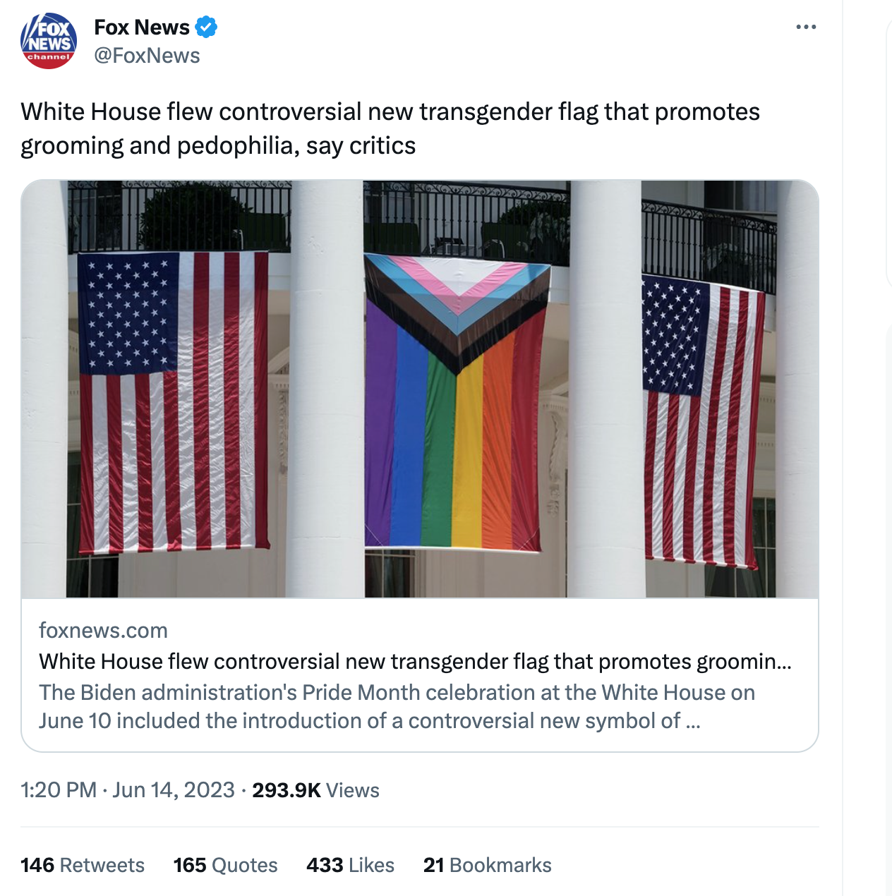 A recent story on Fox News cited prominent critics within the anti-trans movement to support its claim Biden flew a "controversial new transgender flag that promotes grooming and pedophilia."