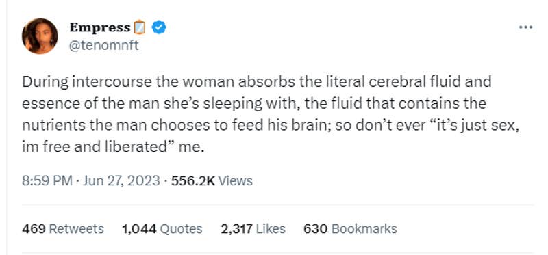 On Tuesday, a Twitter user wrote, "During intercourse the woman absorbs the literal cerebral fluid and essence of the man she’s sleeping with, the fluid that contains the nutrients the man chooses to feed his brain; so don’t ever 'it’s just sex, I'm free and liberated' me."