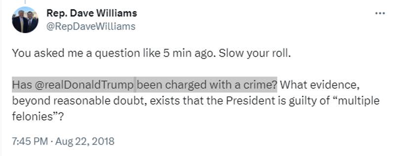 In 2018, he taunted one of his detractors by asking if Trump had been charged with a crime. Five years and multiple indictments later, he may want to rethink leaving that ol’ chestnut on the timeline.