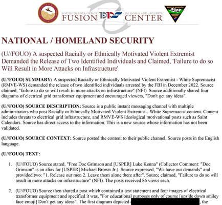 The individual shared "four diagrams of electrical grid transformer equipment" before stating that failure to release the men would "result in more attacks on infrastructure."