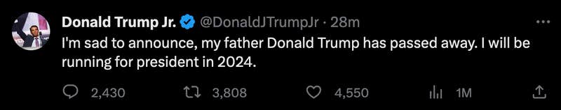 "I'm sad to announce, my father Donald Trump has passed away," the post said. "I will be running for president in 2024."
