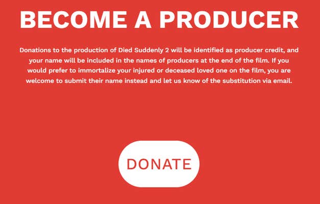 Peters claims the defendants altered the film’s website to accept donations from the public and states that donors would be given producer credits for a Died Suddenly sequel. Peters alleges that he never received any of the money they solicited via donation. He further asserts that he was unaware that they were collecting donations until relatively recently and that his "primary business model centers around selling advertisement/sponsorship spots."