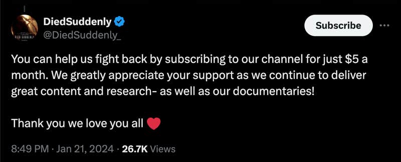 “You can help us fight back by subscribing to our channel for just $5 a month,” the Died Suddenly X account posted in January. “We greatly appreciate your support as we continue to deliver great content and research—as well as our documentaries!”