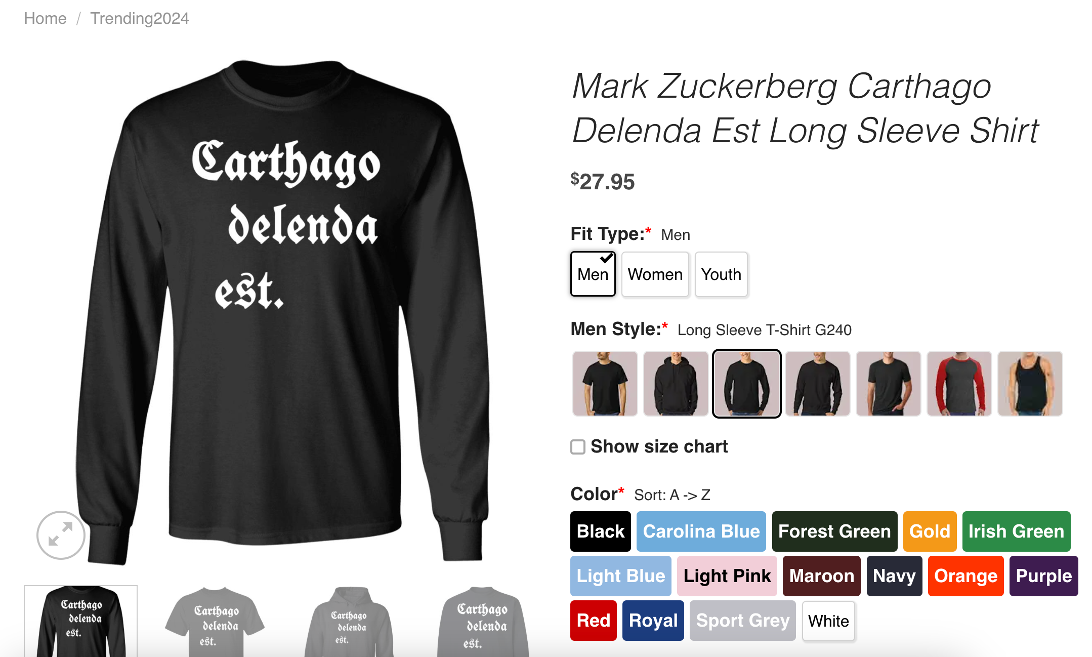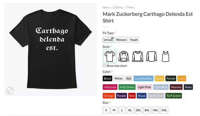 Both Corner Prints and One Rockin now sell Mark Zuckerberg Carthago Delenda Est Shirts.