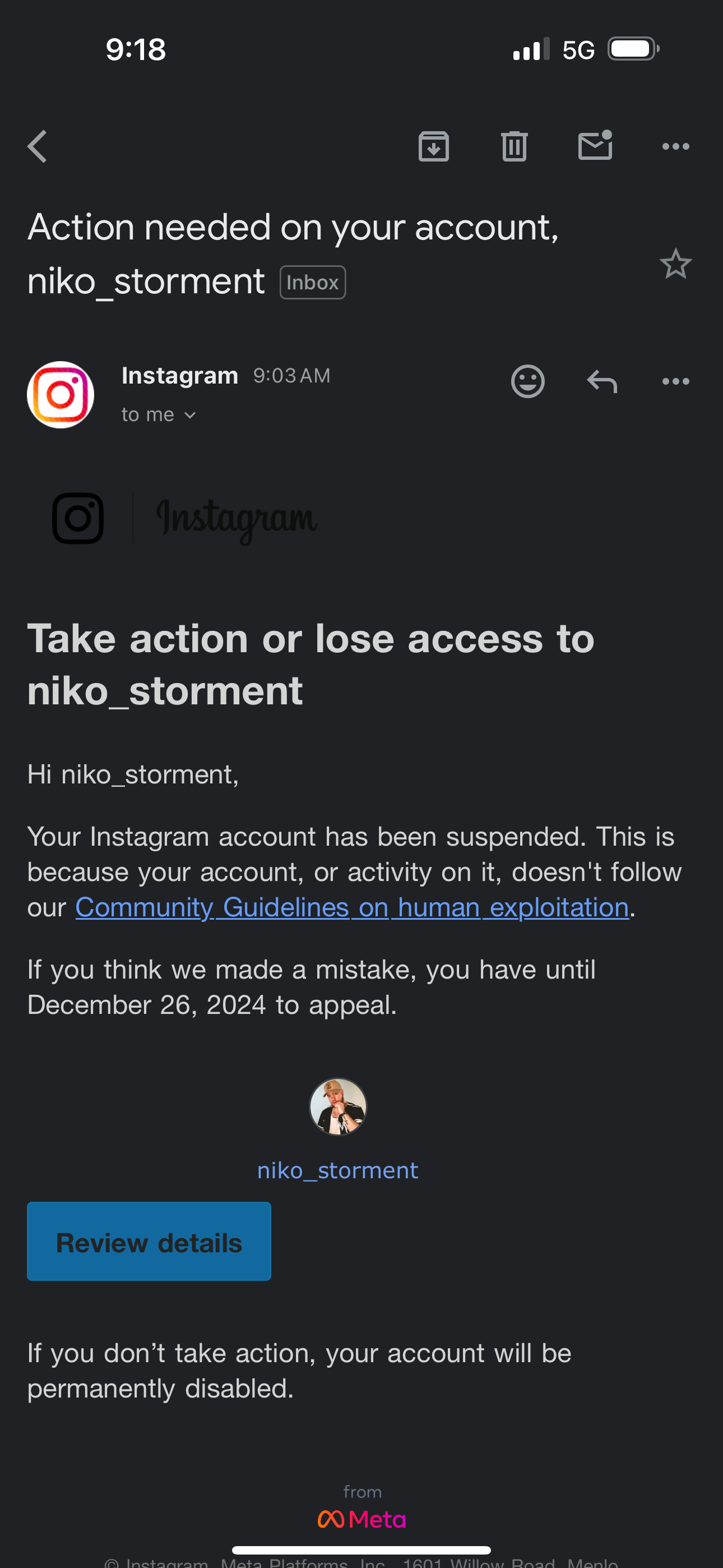 When Storment appealed Meta's decision, he said the company doubled down and again accused his account of using Instagram to engage in human trafficking.