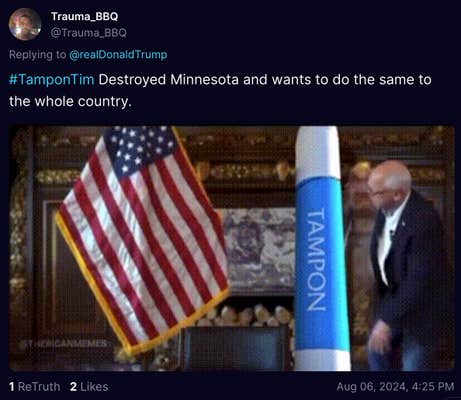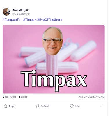 Images of Walz's head on tampons are littering Truth Social, with users also dubbing him "Timpax."