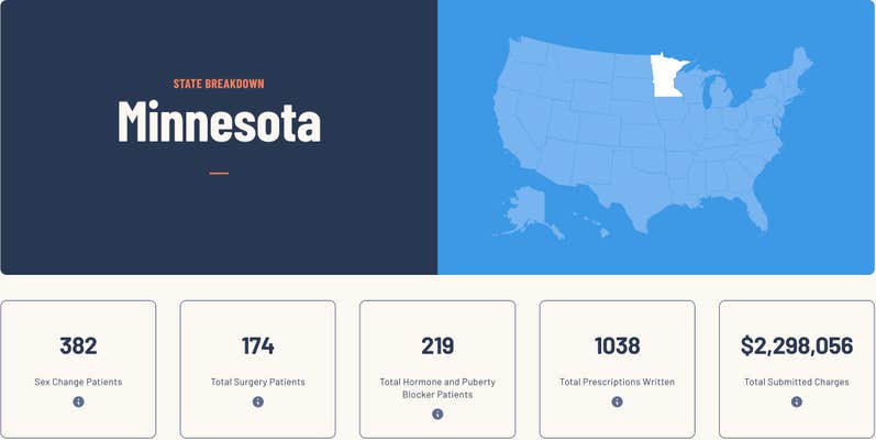 In addition to ranking hospitals, institutions, and providers by how often they provide gender-affirming care, the database also offers state-by-state breakdowns. As shown below in Minnesota's state-specific breakdown, the database states that 382 patients under the age of 18 "underwent gender-affirming procedures or hormone/puberty blocker therapy," which resulted in almost $3.3 million in medical care.