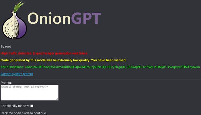 "Say hello to OnionGPT alpha," root said. "It's an uncensored smart assistant accessible over Tor."