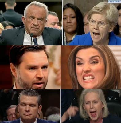 The three men were screenshotted looking saintly and serene, with Hegseth even resting his weary eyes, while the three female interlocutors were depicted as harried and frenzied as possible: A hollering Warren, a sneering Brennan, and an incensed Gillibrand.