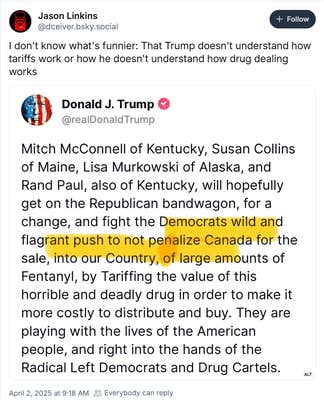 His post was met with widespread mockery by those who realize it’s exceedingly unlikely that drug traffickers will submit tariff declarations for fentanyl at ports of entry. One Bluesky user wondered, "okay so he genuinely thinks that fentanyl smugglers have to pay tariffs lmfao."